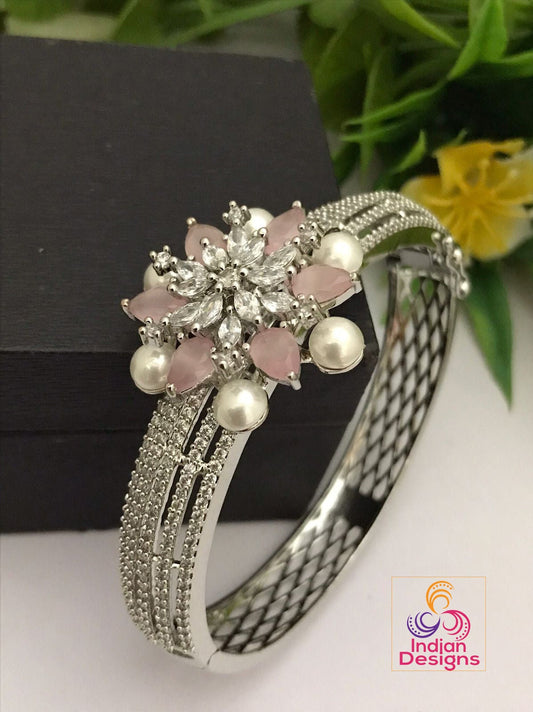 American diamond kada bangle bracelet | CZ stone bangles Silver | Hand Crafted Openable bangles | AD pearls Kada bangle with Floral Design