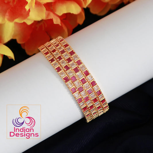 Gold polish Designer bangles studded with round Cz AD ruby stones, High quality Indian wedding bangle set of 4, Gift for her