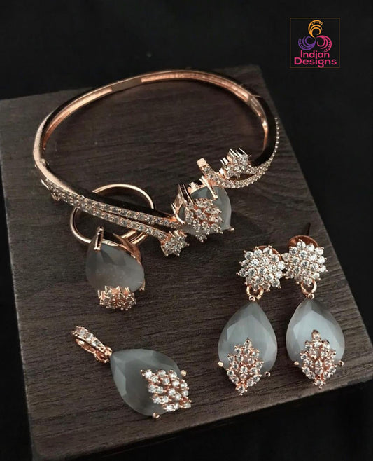 Earrings, ring, Pendant and Bracelet combo | Rose Gold Jewelry set | American Diamond CZ stone Jewelry Gift set for Her | CZ bangle set