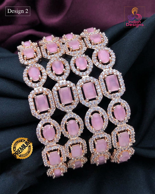 CZ American diamond Pink Stone Bangles set | High Rose Gold AD bracelet and bangles set of four | Indian Bollywood Style Fashion Bangle set