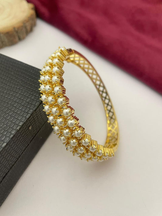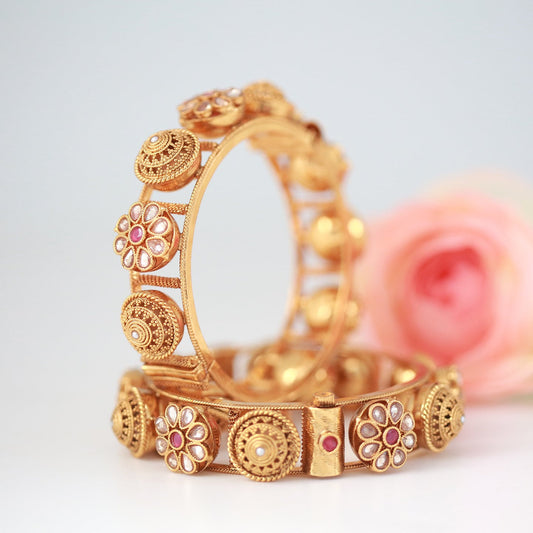 Gold plated Kundan kada bangles for ladies |Openable Polki kada bangle | Pair of Indian Wedding bangles studded with Ruby white round stones