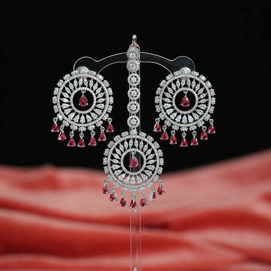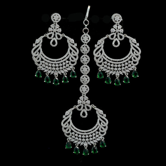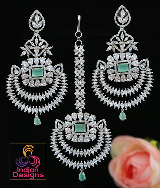Chandbali crystal earrings tikka set Silver tone - Cz Color Stones | Punjabi earrings with maang tikka wedding | Indian Designs collection