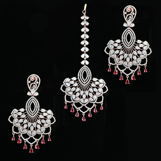 Rose Gold plated American diamond chandbali earrings Mang tikka set | Indian Jewelry Earrings with Maang Tikka Combo Set | Wedding Chandbali