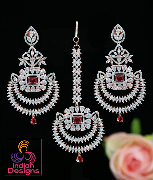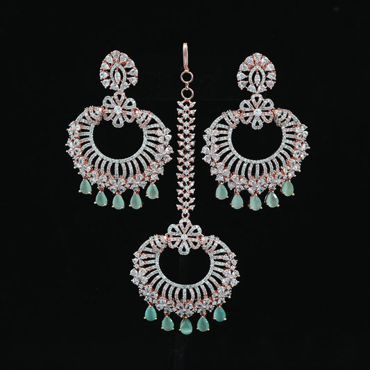 Chandbali crystal earrings tikka set Rose gold - Cz Color Stones | Punjabi earrings with maang tikka for wedding | Indian Designs collection