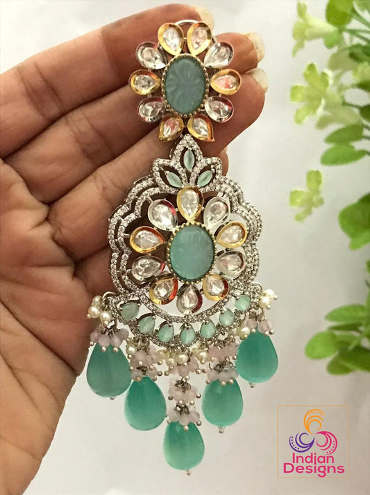 Handmade Real Kundan Wedding Earrings | Bridal Kundan Earring set|American Diamond Large Indian Wedding chandelier earrings|Punjabi Earrings