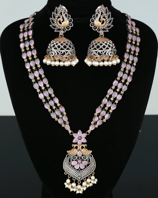 Dual tone German Silver Necklace Earring set | Antique Gold and Oxidized Silver look Color stone Necklace and Jhumka Earrings | Indian Saree jewelry