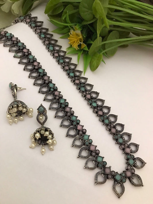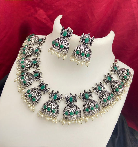 Silver Oxidized Skyblue stone German Silver necklace with Jhumka Earrings |Stone Studded Jhumki Necklace with faux pearl drops |Gift for her