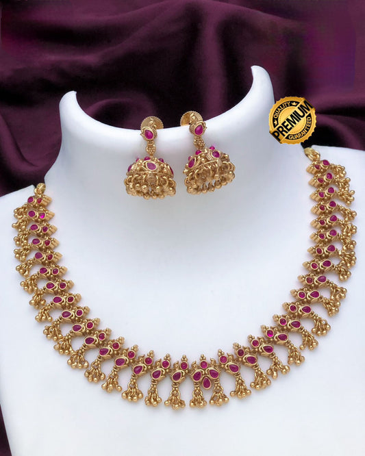 Ruby Pearl Gold Plated Necklace Set| South Indian Temple Jewelry| Luxury Bridal Choker with Jhumka Earrings| Wedding Jewelry| Gift for her