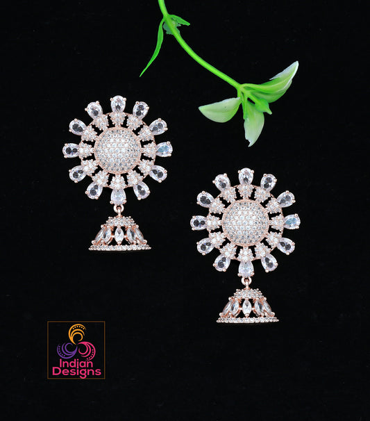 Rose Gold American Diamond Designer Earrings with Small Jhumka Drop