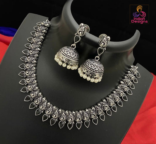 Antique Silver Polish Choker with Jhumka Earrings | Indian oxidized Silver choker necklace set