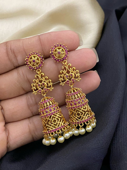 Indian Jhumka Earrings| Gold Plated AD Stone & Ruby Traditional Jhumki with Pearl Drops| Matte gold finish Jhumka| Statement Earrings Gift