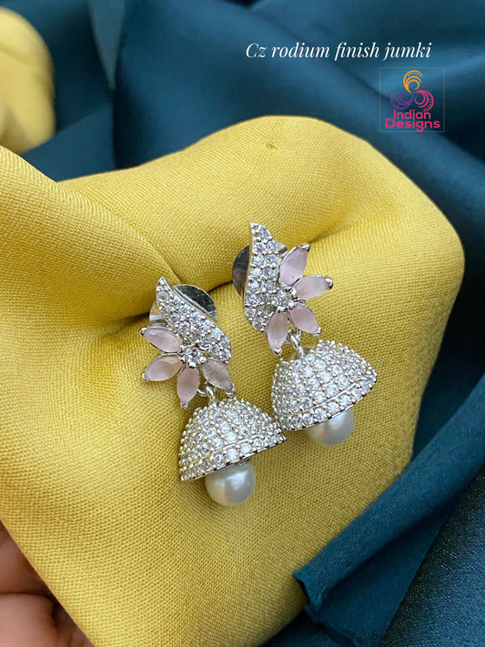 American Diamond Jhumka Earrings| CZ Stone Pearl Drop Jhumka Jhumki| 18K Gold Plated Long Indian Earrings by Indian Designs Gift for her