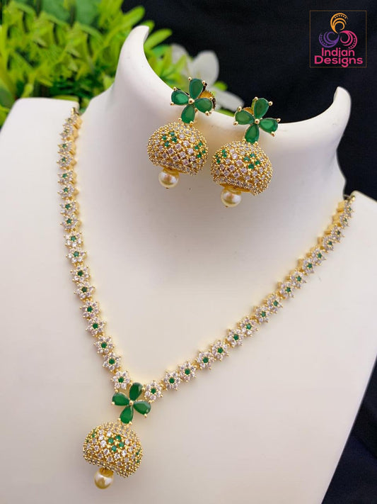American diamond necklace Exclusive design | Floral emerald pendant necklace | Indian Cz necklace and earring sets | Jhumka necklace set