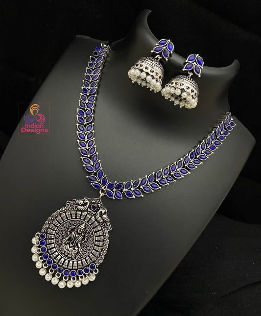 Sky Blue stones Oxidized Silver Necklace and Jhumka set with Lakshmi Pendant | Traditional German Silver oxidized Green stone necklace set
