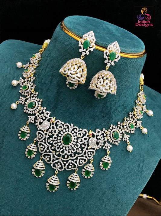 Stunning American Diamond Bridal Choker Jhumka Set with Ruby Stones| Indian Wedding statement Necklace|Ganga Jamuna Emerald stone Choker set