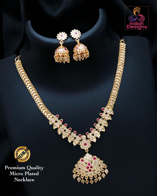 Gold-Plated Bridal Necklace Set with Ruby and AD Stones | Designer Jhumka Earrings & Pearl Drops | South Indian style Necklace| Gift for her