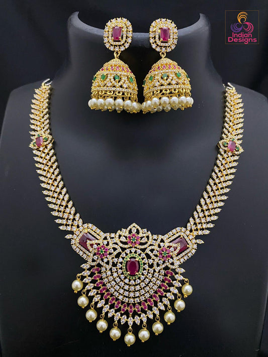 Indian Jewelry American Diamond Long Necklace & Jhumka Earrings Set, Peacock Motif Bridal Gold-Plated Jewelry with Pearls and Ruby Accents