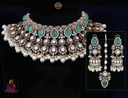 Pink -Victorian Doublet Moissanite Polki Choker Necklace and Jhumka Earrings, Maang Tikka & Pearl Drops| Big Size Statement Wedding Jewelry
