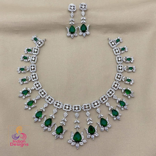 American diamond necklace set &earrings| teardrop ad stone silver necklace| green / pink / ruby / white bridal wedding jewelry| gift for her