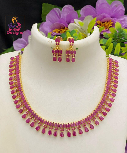American Diamond Ruby Pear Necklace Set with Earrings| Gold Plated CZ Choker set| Bridal Wedding & Party Wear Indian Jewelry| Gift For her