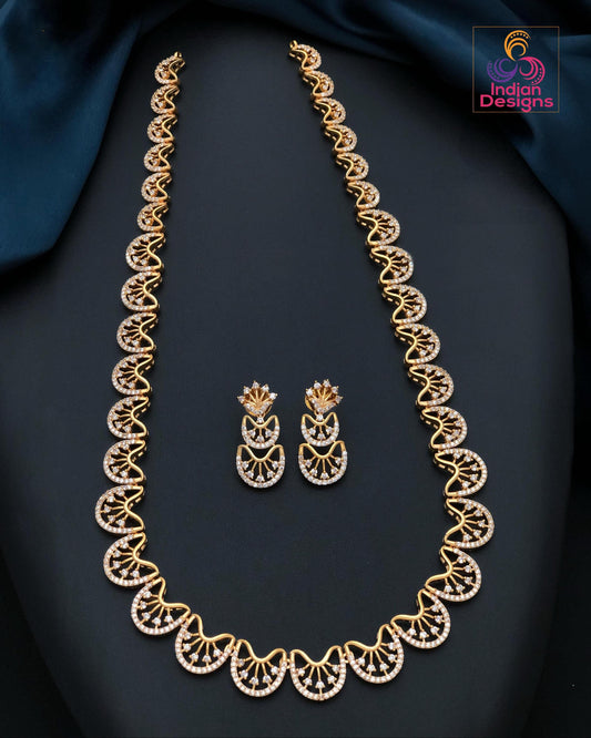 American Diamond long necklace set| Ruby, Emerald & White Variants| Matte Gold South Indian Jewelry| Lightweight AD Necklace| Gift for her