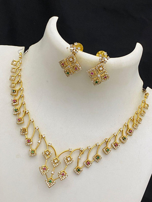 Matte Gold Necklace Earrings Simple choker set| American Diamond Ruby and Emerald Necklaces| Traditional gold necklace designs| Gift for her