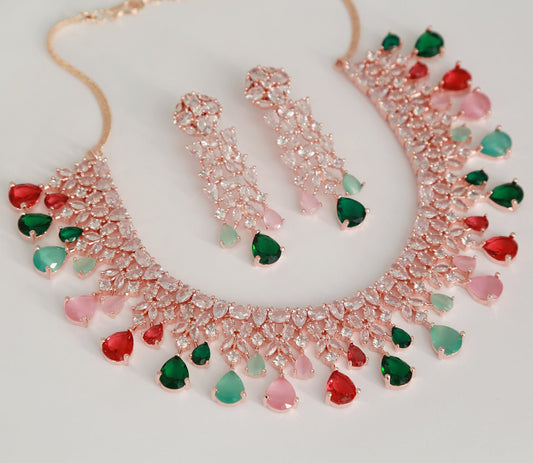Rose Gold American Diamond Indian Bridal Necklace | Bollywood Style Multi color stone Choker jewelry | CZ statement Necklace | Gift for her