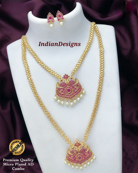 Gold Plated American Diamond CZ Long and short necklace combo, South Indian Wedding Jewelry set, Bollywood fashion Jewelry, Gift for Her