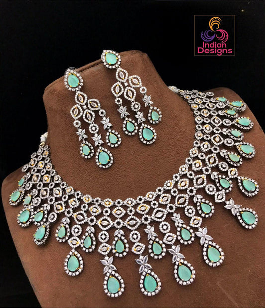 Stunning victorian polish cz american diamond wedding jewelry|stylish statement necklace |indian bollywood style ad choker set |gift for her