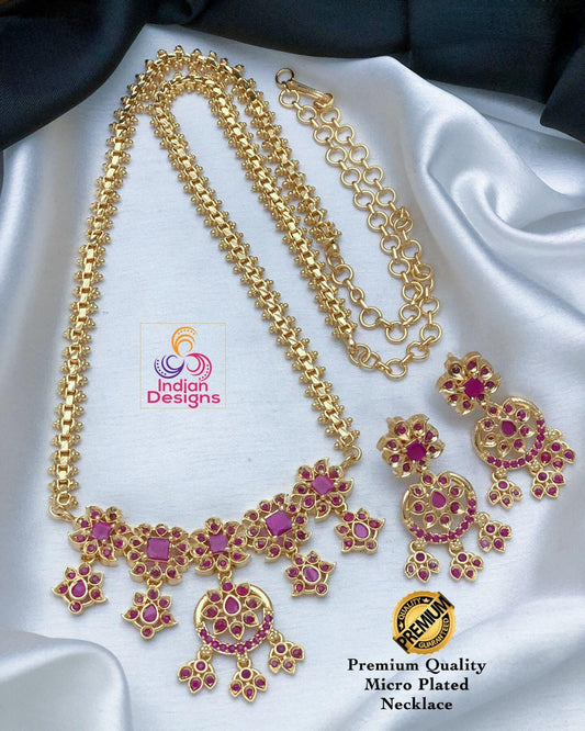 Ruby CZ Long Necklace Set with Jhumka Earrings| Gold Plated American Diamond Bridal Jewelry| Pearl Drop Jhumka Earrings| Gift for her