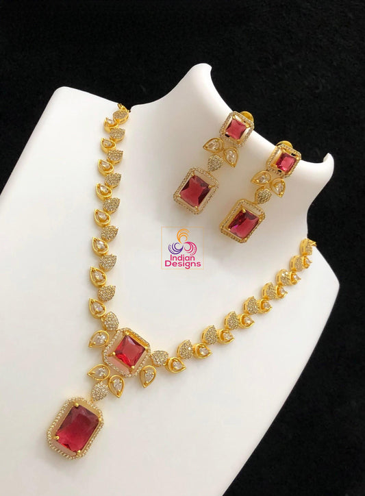 Elegant ruby & cz diamond necklace set for weddings| luxury wedding necklace for brides| statement jewelry set| american diamond necklace