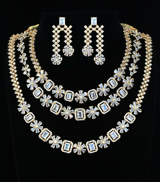 Mothers Day Gift, 3 layer American Diamond Gold Floral necklace, Multi-strand CZ wedding Designer jewelry, Statement Jewelry Indian Designs