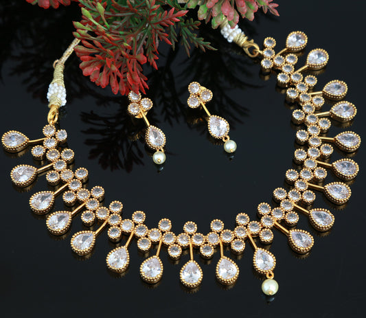 22k Gold plated American Diamond Simple choker Necklace Earring set, Daily wear Jewelry, South Indian fashion necklace set, Gift for Her