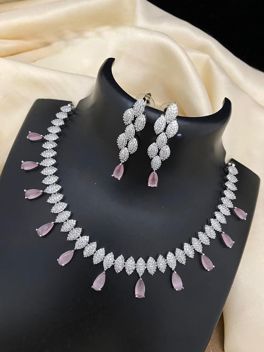 Rhodium Polish CZ American Diamond Pink Necklace, Wedding Choker party wear Statement Necklace, Bollywood Necklace
