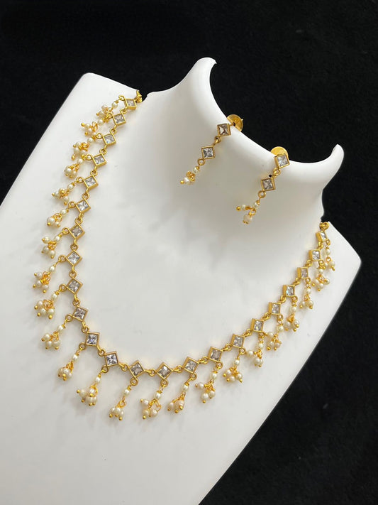 Gold Plated simple Daily wear American Diamond Pearl Choker necklace Earring set, Pearl and Crystal choker, South Indian Jewelry Gold choker