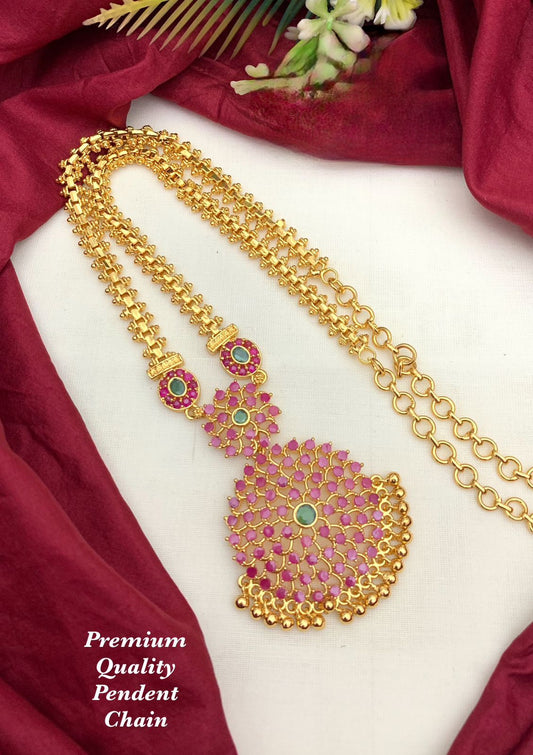 One Gram Gold plated Premium Quality Pendant and chain with AD stones, American Diamond Floral design pendant with Ruby and emerald CZ color stones, Gift for her