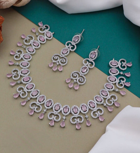 Pink American Diamond choker Necklace Earring set | Silver Finish CZ Diamond Silver choker |Pink AD set \ Gift for her