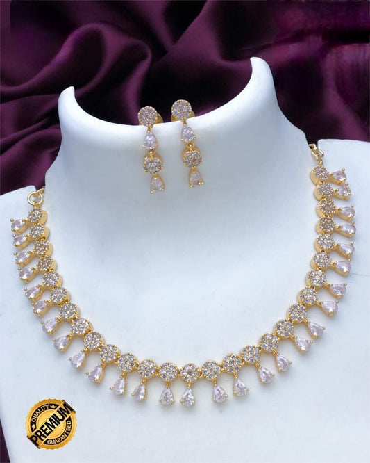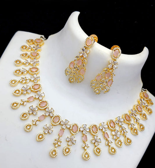Baby Pink & White CZ Necklace Earring Set | American Diamond Gold Plated necklace and Earring| Wedding Jewelry necklace set| gift for her