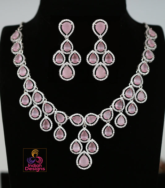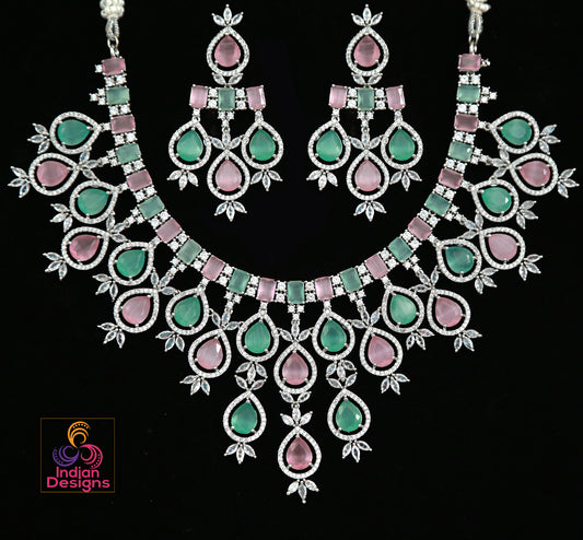Pink Mint Tear drop stones American Diamond Necklace|Silver Necklace CZ Tear Drop stones|Indian Jewelry|Pakistani Wedding choker|Bollywood fashion|Punjabi Wedding jewelry|Indian Bride USA
