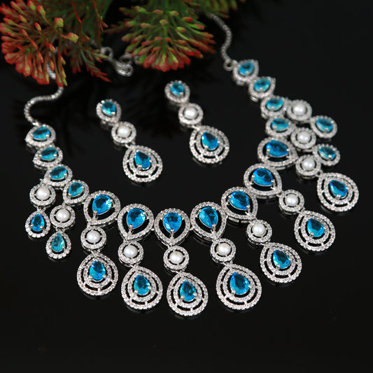 American Diamond Silver necklace with Tear-Drop CZ Blue stone| Indian wedding Jewelry|Pakistani jewelry| Bollywood style Bridal Necklace