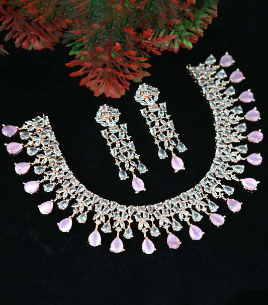 Rose Gold CZ Pink Stones Necklace - Statement jewelry American Diamond Jewelry for Indian and Pakistani Bridal, Bollywood and Indian Wedding