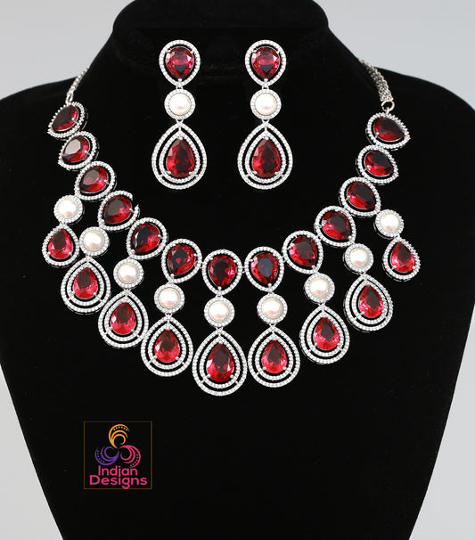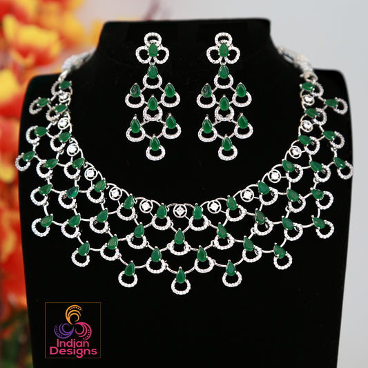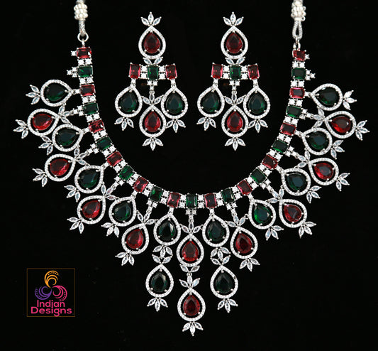 Ruby And Emerald Green Silver American Diamond Necklace Earring set|Indian CZ stones Necklace|Pakistani Bridal Jewelry|Gift for her