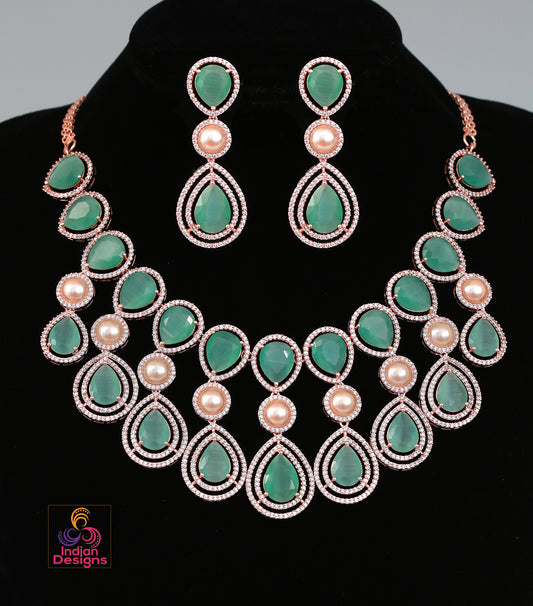 Rose gold American diamond necklace | High Quality CZ Diamonds Mint Green stone Necklace Earrings Set