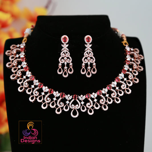 Rose Gold American Diamond Wedding Jewelry|Unique Design Necklace|Indian Wedding Jewelry|Gift For Her