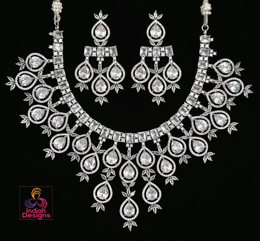 Silver American Diamond Necklace with White CZ Tear Drop stones|Indian Jewelry|Pakistani Wedding choker|Bollywood fashion|Punjabi Wedding jewelry|Indian Bride USA
