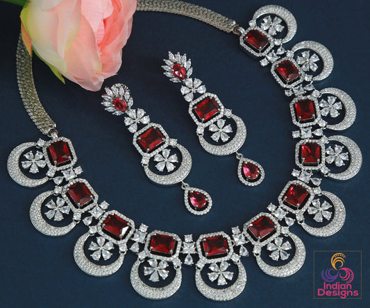 American Diamond Multi-Layer Necklace and Earrings set with CZ White/Ruby Stones| Statement Wedding Necklace| Indian Jewelry| Gift for her