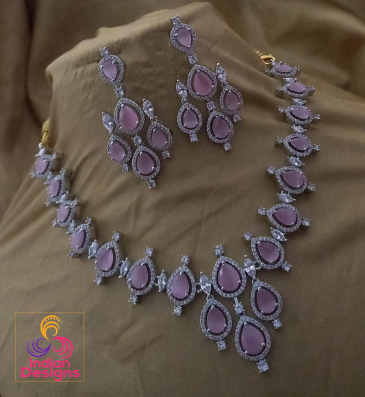 CZ Diamonds Silver Necklace Earrings Set | Pink Bridal Necklace Indian Jewelry Set | Statement Choker set Crystal Jewelry | Indian designs