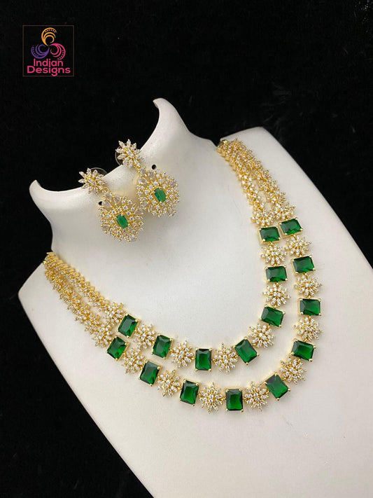 American diamond 2 line necklace earring set with premium quality gold plated | blue sapphire two strand emerald cut cz crystal jewelry set
