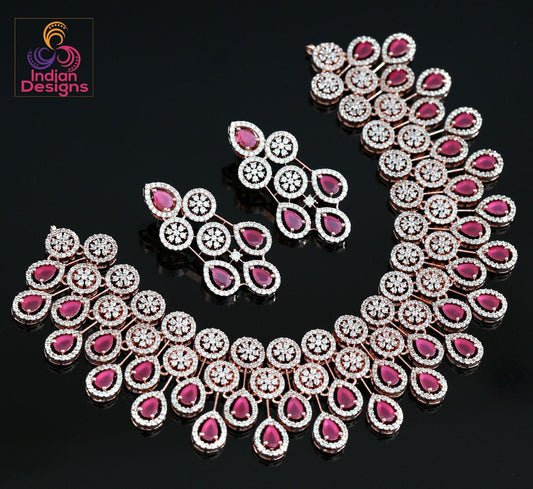 Rose Quartz Stylish Wedding Artificial American Diamond Choker Necklace jewelry|Rose Gold Plated American Diamond Jewelry