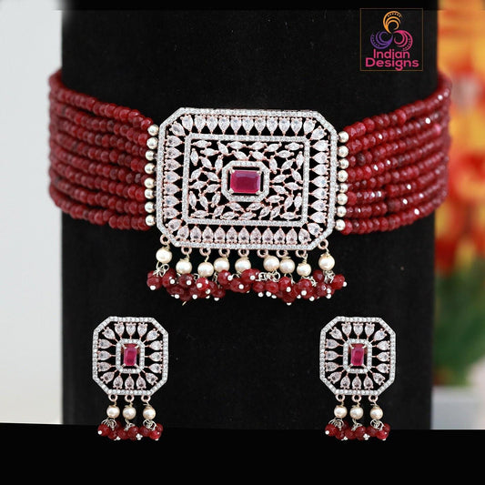 Wedding choker necklace set American diamond choker necklace set | Star Design Ruby and White Crystal gold Polish Wedding Bridal necklace